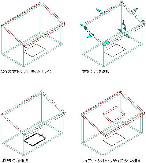 注: 外側の開口か、スラブまたは屋根スラブの軒の出の位置でスラブの基準線または外周線に重なる開口を作成すると、スラブまたは屋根スラブのボディは切断されますが、鼻隠しと軒天井は残ります。この場合は、スラブまたは屋根スラブを切断して開口を作成することをお勧めします。