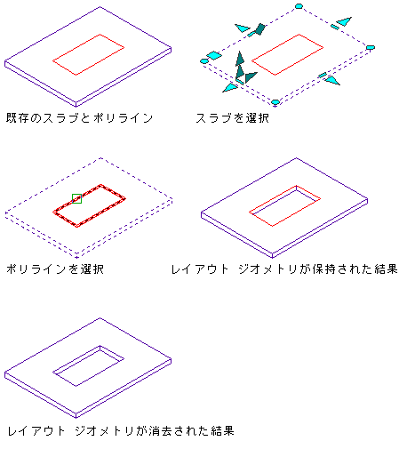 - 閉じたポリラインから作成される開口は、現在のユーザ座標系(UCS)を使用して、ポリラインからスラブまたは屋根スラブに投影されます。