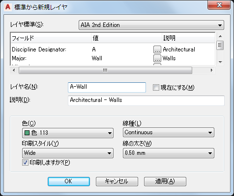 終了すると、選択した値の組み合わせが、[レイヤ名]フィールドと[説明]フィールドに表示されます。 たとえば、BS1192 レイヤ標準に従って倉庫の棚用の新しいレイヤを作成した場合、その名前は A746G となります。