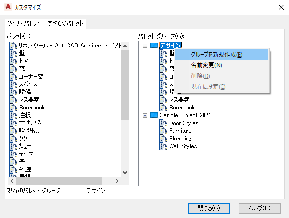 ヒント: [カスタマイズ]ダイアログ ボックスは、パレットをプロジェクトのパレット グループに追加するのにとても便利です。