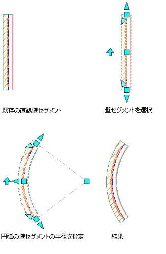 曲線壁を直線壁に変更すると、曲線の始点と終点の間に直線セグメントが作成されます。 グリップを使用して、壁の長さと位置を調整することができます。
