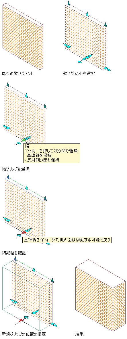 壁の反対側の面を保持したままグリップを使用して壁の幅を変更するには