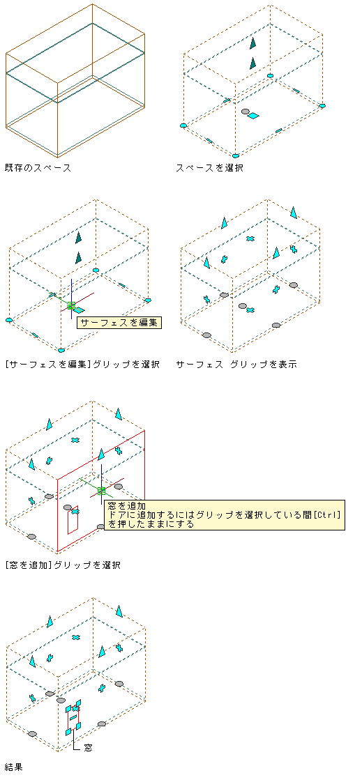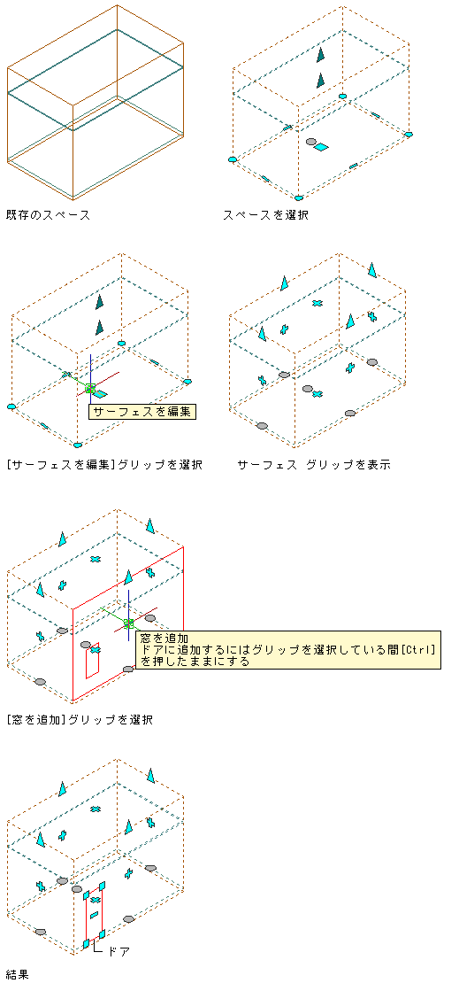 ドアを追加するには、[Ctrl]を押しながら[窓を追加]グリップをクリックします。 ドアは床サーフェスの上に配置されます。