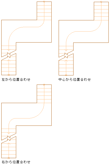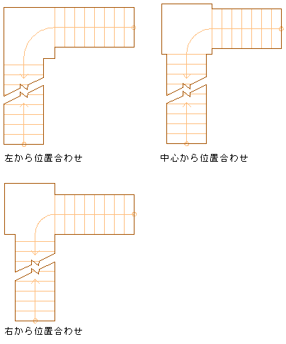 踊り場のタイプと階段の位置合わせによって、追加幅が踊り場に追加される位置が決まります。