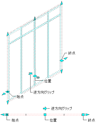 カーテン ウォール ユニットの始点、終点、位置、方向を反転の各グリップを表示