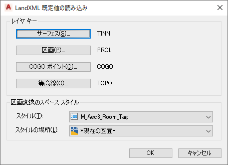読み込んだ異なるタイプの LandXML データに既定のレイヤ キーを設定するには、次の操作を実行します。COGO ポイント、区画、サーフェス、等高線ラインに対して個別にレイヤ キーを設定できます。
