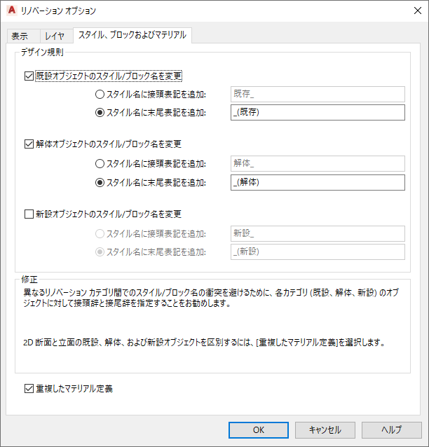 オブジェクトのリノベーション カテゴリに基づいて、スタイル名とブロック名に接頭辞または接尾辞を自動的に追加するには、リノベーション デザイン規則を修正します。接頭辞や接尾辞を事前に定義せずに、同じスタイル名またはブロック名が、図面内の別のカテゴリに存在する場合は、警告が表示され、新しい名前を手動で入力できます。