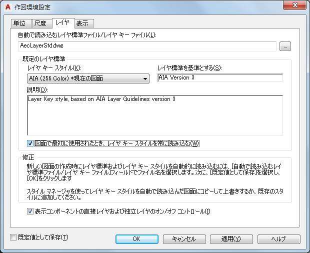 | テンプレートを使用しないか、作図環境設定の情報を含まないテンプレートから作成する新しい図面に、レイヤ設定を既定の設定として保存するには | [既定値として保存]をオンにして、[OK]をクリックします。[単位]タブと[尺度]タブの設定も、既定の設定として保存されます。 |