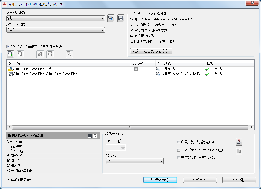- [マルチシート DWF をパブリッシュ]ダイアログ ボックスで、[パブリッシュ]を選択します。