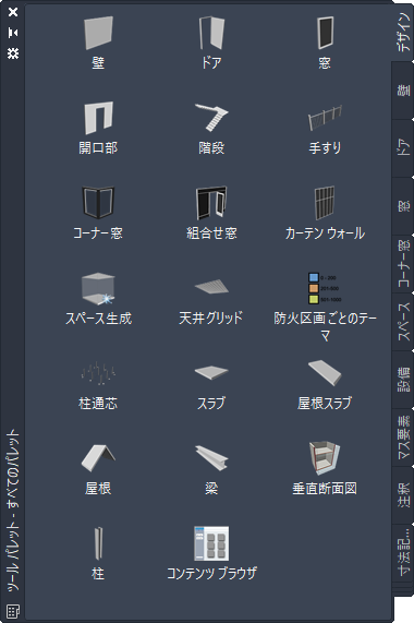 | オブジェクト ツール | オブジェクト ツールは、壁や組合せ窓などの設計オブジェクトを図面内に挿入します。オブジェクト ツールは特定のスタイルと特定のオブジェクト プロパティを持ちます。たとえば、壁ツールは、レンガ-4 レンガ-4 と呼ばれます。 |