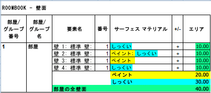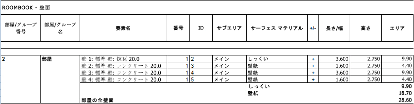 1 部屋あたりの窓面積と[壁サーフェス]列の合計に関する情報は、Excel ファイルでは[全ルーム量の測量]タブにあります。