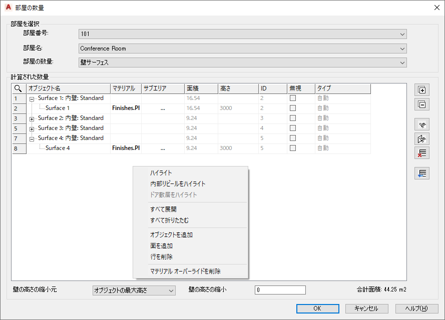 - 計算された各ルーム量(壁サーフェス、床サーフェス、天井サーフェス)の参照ボタンをクリックし、