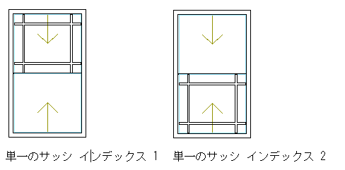 | 個々のサッシ コンポーネントに組子を適用するには | [窓ガラス]で[その他]を選択します。[片開き]を選択し、ウィンドウ サッシのインデックス番号を指定します。サッシは、左下コーナーから反時計回りにインデックスが付いています。 |