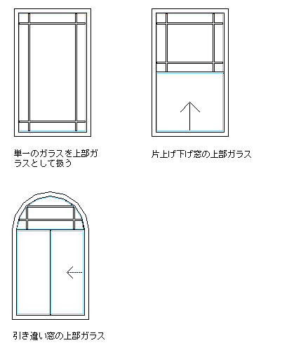 | 最上部のサッシだけに組子を適用するには | [窓ガラス]で[上]を選択します。組子を単一のサッシに適用する場合も[上]を選択します。 |