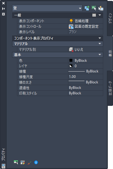 プロパティ パレットの[デザイン]タブでオブジェクトの物理プロパティをコントロールできるように、[表示]タブではオブジェクトの視覚的なプロパティを、境界やハッチなど個々の表示コンポーネントの設定を調整することで、コントロールできます。このタブでの変更内容は、すぐに[プラン]や[モデル]など現在有効な表示レベルで見えるようになり、変更内容を他の表示レベルにも適用することもできます。また、[デザイン]タブの設定は現在選択しているオブジェクトだけに適用されますが、[表示]タブ プロパティに対して行う変更を、そのタイプのすべてのオブジェクトに対して選択したコンポーネントに適用するか、そのスタイルのすべてのオブジェクトに適用するか、または選択したオブジェクトだけに適用するかを指定できます。表示コンポーネントがマテリアルによってコントロールされる場合、変更内容はそのマテリアルを使用するすべてのオブジェクトに適用されます。
