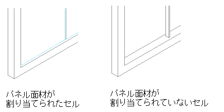 セルの面材を除去してセルを空にするには、次の手順を実行します。このとき、要素定義として[なし]を使用します。[なし]を使用すると、セルの境界であるすべてのフレーム エッジが除去されますが、マリオンには影響はありません。