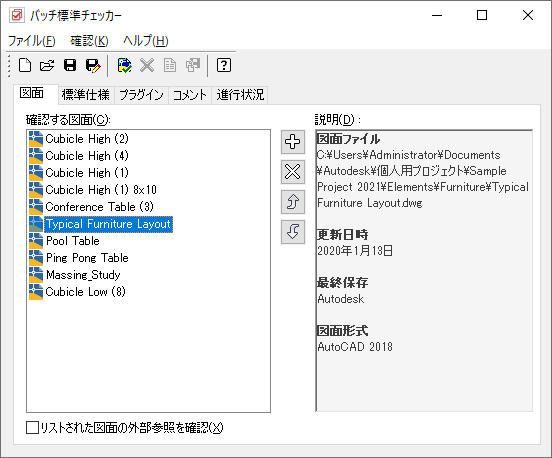 プロジェクトの AutoCAD 標準をセットアップすると、プロジェクト名を持った CHX バッチ チェッカー ファイルが、プロジェクト フォルダに作成されます。CHX ファイルには、チェックされる図面として、すべてのプロジェクト図面のリストと、照合する図面として、指定したすべての AutoCAD 標準仕様ファイル(DWS)のリストが含まれます。プロジェクト全体を AutoCAD 標準に対して同期したい場合は、AutoCAD バッチ標準チェッカーを使用して、このバッチ ファイルを実行する必要があります。