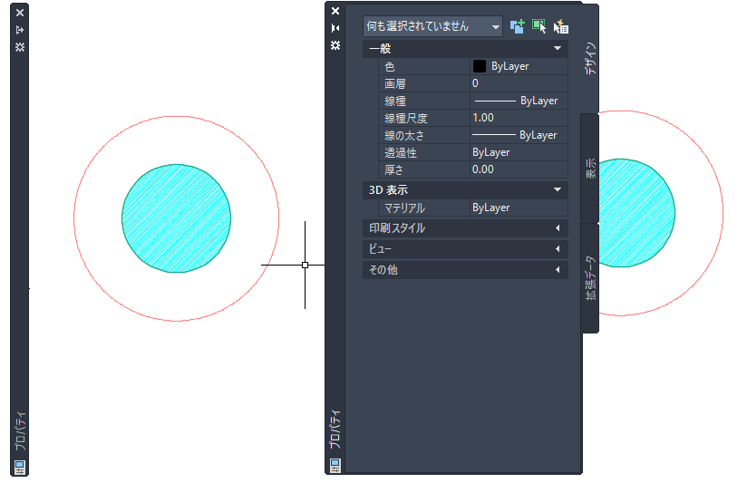 プロパティ パレットの非表示(左側)と再表示(右側)