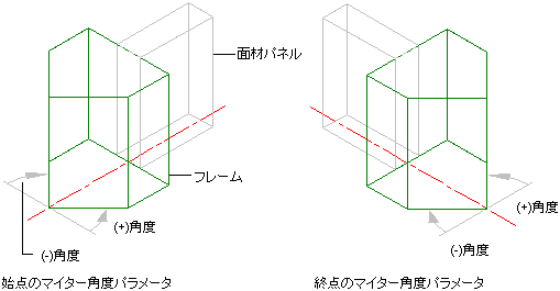 | カーテン ウォール ユニットをカーテン ウォールの始点でマイター接続するには | [始点のマイター]に角度を入力して、[Enter]を押します。 |