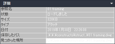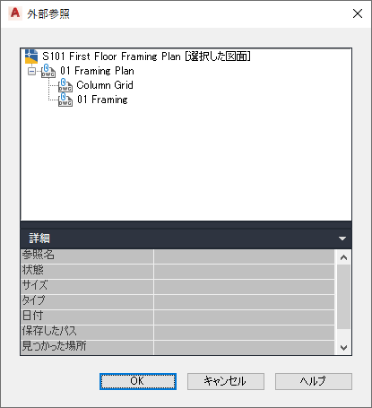 - [外部参照]ダイアログ ボックスで、外部参照の詳細を表示します。