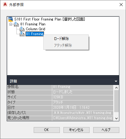 コンテキスト メニューから、アタッチされている外部参照のロード解除、再ロード、アタッチ解除を行うことができます。