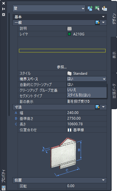 注: AutoCAD、Civil 3D、Land Desktop などの AutoCAD Architecture 2027 toolset Object Enabler 環境で図面を開いたり、AutoCAD Architecture 2027 toolset を AutoCAD として実行する場合、[境界スペース]プロパティは表示されません。[境界スペース]プロパティが表示されるのは、AutoCAD Architecture および MEP ツールセット が完全インストールされている場合だけです。