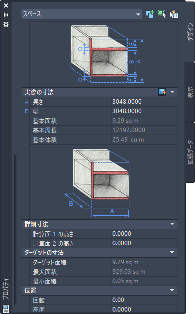 3D 自由形状スペースを使用している場合は、切断面の 2 つの異なる高さで面積を計算できます。 これは、異なる高さが計算される屋根裏に便利です。