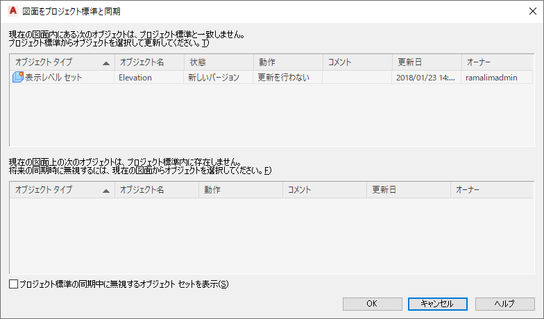 この場合は、非標準のバージョンは、現時点のプロジェクト図面に残り、標準バージョンにより更新されます。次回に図面が同期されると、スタイルまたは表示設定は、古いバージョンまたは非標準のバージョンとして再びリストされます。