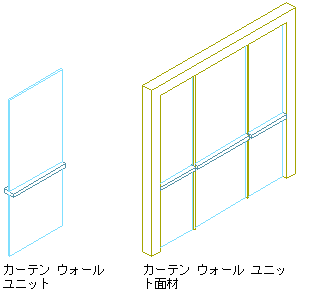 グリッドに挿入できる他のオブジェクトには、カーテン ウォール ユニットと組合せ窓があります。カーテン ウォール ユニットは、主カーテン ウォール 内で反復される複雑な要素を表現するためのものです。