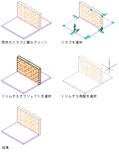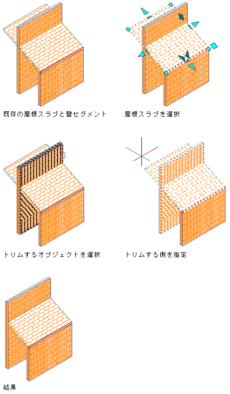トリミング オブジェクトの現在のユーザ座標系(UCS)での投影がスラブまたは屋根スラブと交差していれば、トリミング オブジェクト自体がスラブまたは屋根スラブと交差している必要はありません。しかし、トリム面はスラブまたは屋根スラブの外周線と交差する必要があります。軒の出のみをトリムすることはできません。