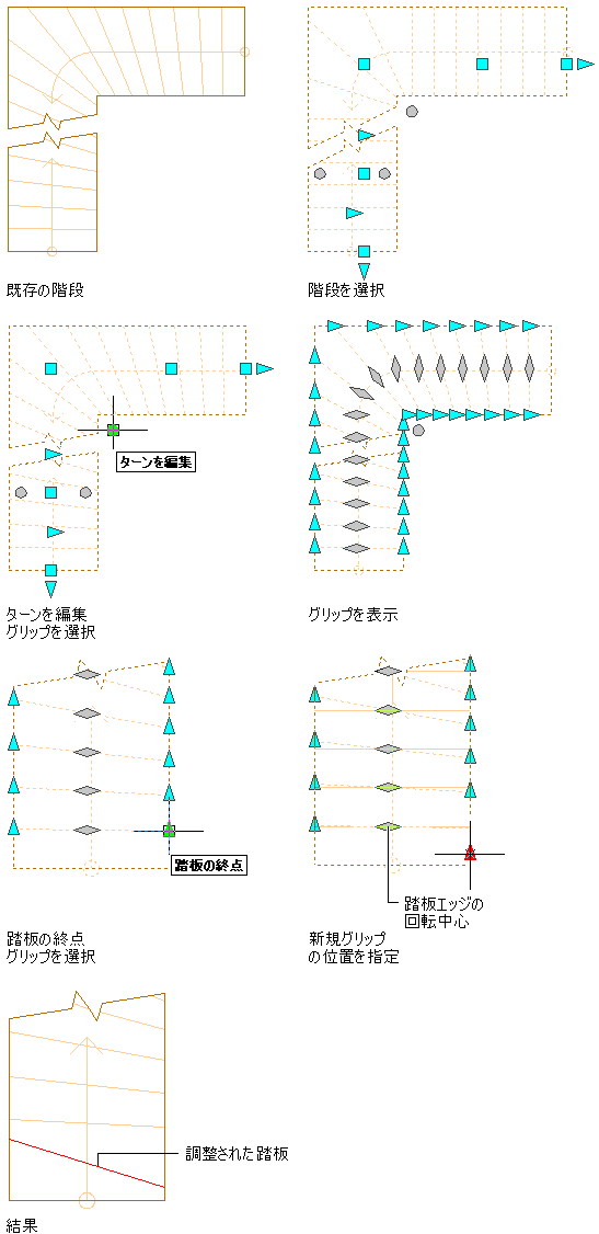 [手動 - 踏み板]または[手動 - 平衡]曲階段スタイルのいずれかを割り当てた階段の個々の踏み板の端を動かすには、この手順を実行します。各踏み板の端または蹴り込みの面は、踏み板の端と階段の構成線の交線によって決まる点を中心に回転します。[踏み板の端]グリップをドラッグして、踏み板の端の新しい角度を指定します。