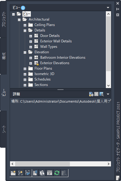 プロジェクト ナビゲータ パレットの[ビュー]タブでは、建物データの個々のビューを作成します。ビューは構成を含み、プロジェクト内の注記、タグ、寸法などの注釈の追加は主にここで行います。ビュー図面を作成したら、図面内にモデル空間ビューを作成できます。