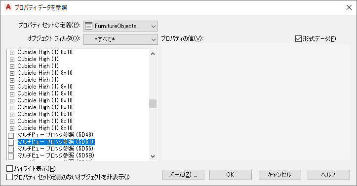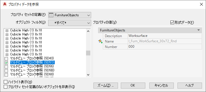 | 選択したプロパティ セット定義がアタッチされているオブジェクトのみを表示するには | [プロパティ セット定義のないオブジェクトを非表示]を選択します。 |