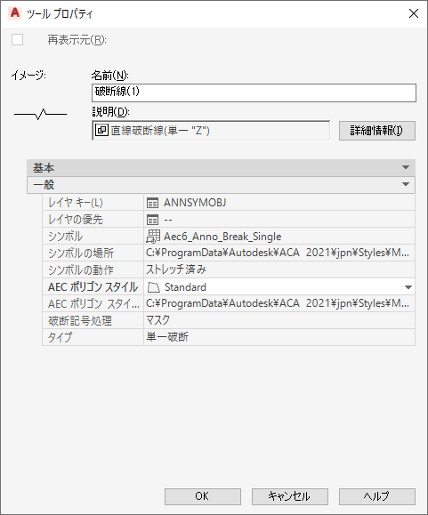 | AEC ポリゴン スタイル | 破断記号にマスク プロパティを持たせるかどうかについて指定します。このプロパティを指定しなかった場合(--)には、スタイルの既定値は、標準スタイルになります。 |