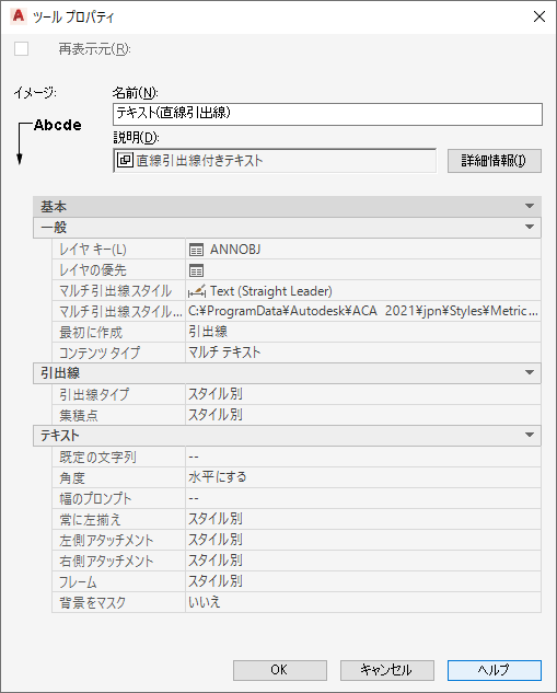 | マルチ引出線スタイル | 注釈のマルチ引出線スタイルを指定します。使用可能なスタイルには、[テキスト]、[ブロック]、[標準]などがあります。 |