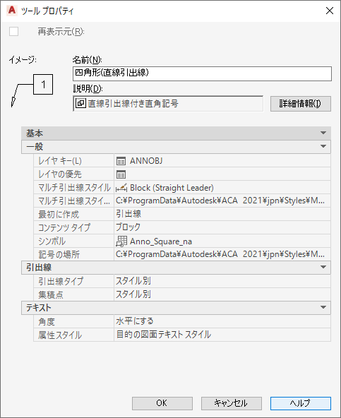 | 引出線/引出線寸法スタイル場所 | 現在の図面の寸法スタイルと異なる場合には、寸法スタイルの場所を指定します。プロパティをクリックして、ドロップダウン リストから[参照]オプションを使用して、選択したスタイルのパスを特定して入力します。既定では、このプロパティが未指定(--)の場合、現在の図面ファイルにある寸法スタイルのみが使用されます。 |