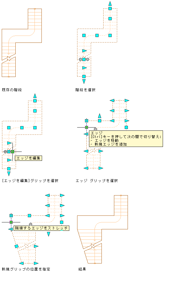 グリップを使用してある踏み板を踊り場の方に押し込むと、踊り場が強制的に他の方向に延ばされます。ある踏み板を踊り場から引き寄せても、踊り場の他の端には影響しません。階段は、大きい方の踊り場に合わせて、階段の一番上まで延ばされます。一番上と一番下のグリップ(階段の歩行パスの両端のグリップ)を使用して、長さを修正できます。