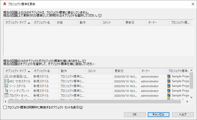 この場合は、[プロジェクト標準の同期中に無視するオブジェクト セットを表示]をオンにした場合、または[無視]フラグをスタイル マネージャのスタイルから[無視]フラグを除去した場合を除き、非標準のスタイルが将来の更新でリストされることはありません。