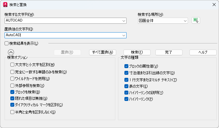 [検索する場所]リストから選択した項目によって、図面全体または現在選択しているオブジェクト内の文字列が検索されて置き換わります。