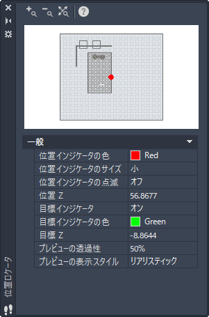 目標位置インジケータの Z 座標を指定します。作図領域で点を指定するか新しい値を入力することによって、設定を変更することができます。