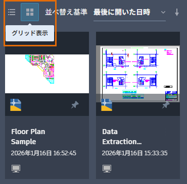 - ドキュメントの上で、サムネイルとテキストを表示するグリッド表示か、テキストのみを表示するリスト表示かを選択します。