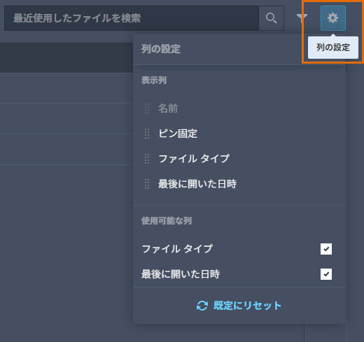 リスト表示の右上コーナーにある[列の設定]アイコン(歯車)を使用して、表示する列とその順序を切り替えて表示をカスタマイズできます。[名前]列と[ピン留め]列は、常に最初および最後の列として表示されます。