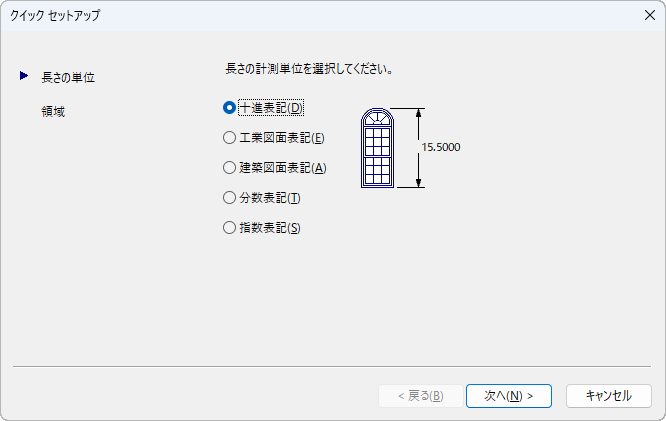 [クイック セットアップ]ウィザードには、[長さの単位]と[領域]の 2 つのページがあります。ウィザードの使用中は[戻る]ボタンと[次へ]ボタンでページを切り替えることができます。また、最後のページで[完了]ボタンをクリックすると、ウィザードを閉じて[クイック セットアップ]ウィザードで指定した設定に基づいて新しい図面を作成できます。