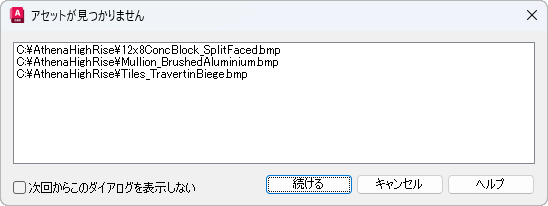 このダイアログ ボックスは、現在は使用されていないパスのテクスチャ マップを含むシーンをレンダリングするときに表示されます。たとえば、テクスチャ マップを移動または削除している場合、または図面ファイルをドライブの割り当てが異なるコンピュータに移動した場合に表示されます。