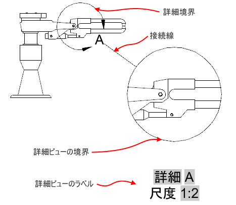 モデル ドキュメント詳細ビューは、既存の図面ビューから生成された投影ビューです。詳細ビューには、図面ビュー(詳細ビューの生成元)の特定の部分が拡大された尺度で表示されます。