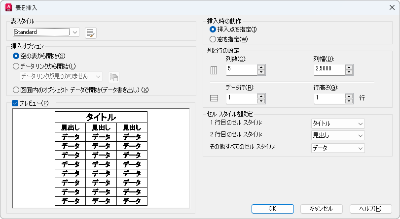 表のサイズと位置を指定します。ポインティング デバイスを使用するか、コマンドのプロンプトに対して座標値を入力します。このオプションを選択した場合、行数、列数、列幅、行高さは、窓のサイズおよび行と列の設定により決まります。