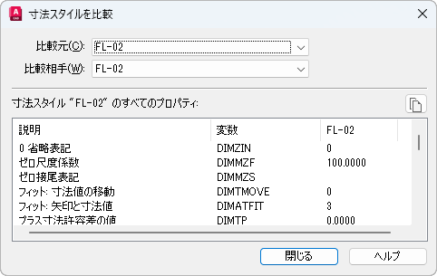 寸法スタイルの比較結果が表示されます。2 つの異なる寸法スタイルを比較した場合、異なるプロパティが表示されます。[<なし>]を選択するか、[比較元]の寸法スタイルと同じ寸法スタイルを設定した場合は、その寸法スタイルのすべてのプロパティが表示されます。