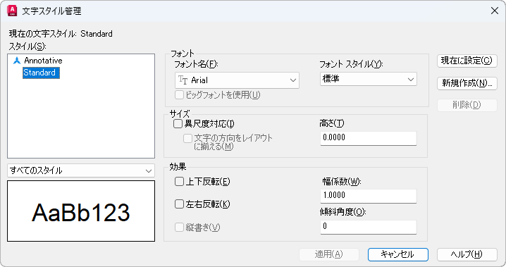 注: 既存の文字スタイルの方向またはフォント ファイルを変更した場合、図面を再作図するとそのスタイルを持つすべての文字オブジェクトに新しい値が使用されます。