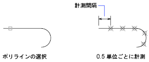 図では、MEASURE コマンドでポリラインに沿って 0.5 単位ごとにマークを付けています。このときのシステム変数 PDMODE は、35 です。