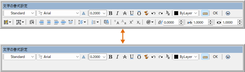 [文字の書式設定]ツールバーの表示をコントロールします。このオプションにより、システム変数 MTEXTTOOLBAR が設定されます。(1 行文字の場合は使用できません)